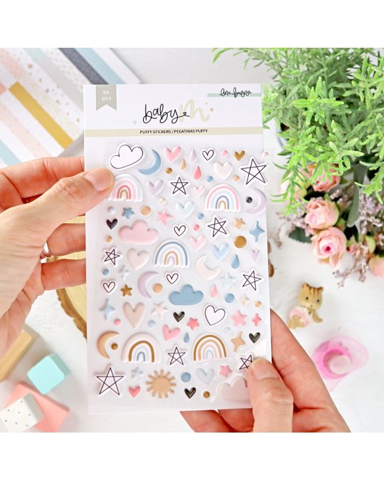 Collection Baby M - Lora BailoraPlanche d'autocollants puffy. 94 éléments (étoiles, cœurs, arcs en ciel, soleil, lune...)Format 10x18cm