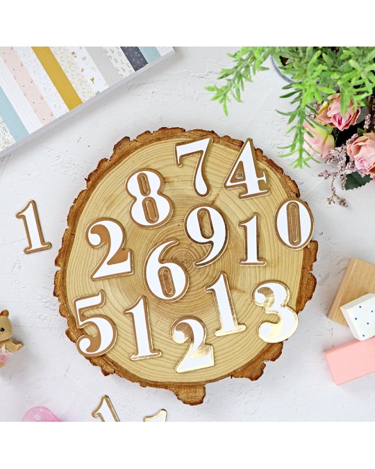 Collection Baby M - Lora Bailora Assortiments de formes découpées dans du carton 1mm. Impression recto. Le sachet contient 39 découpes chiffres et étiquettes blanc et foil doré. Sans acide ni lignine.