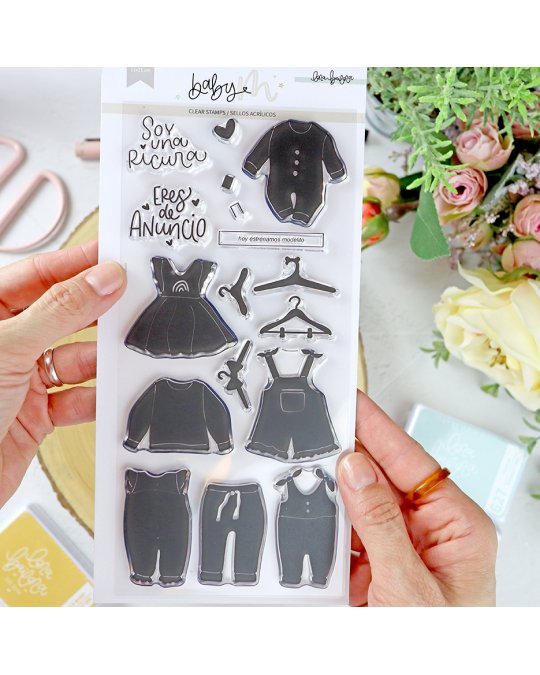 Planche de 17 tampons sans résine, acrylique, caoutchouc ou silicone. Hautement transparent et résistant.