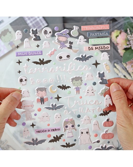 Collection Cute Halloween - Alúa CidPlanche d'autocollants puffy pour décorer vos créations : scrapbooking, rita's diary (project life®), carterie, layout...80 élémentsFormat 15x21cm - Finition mat