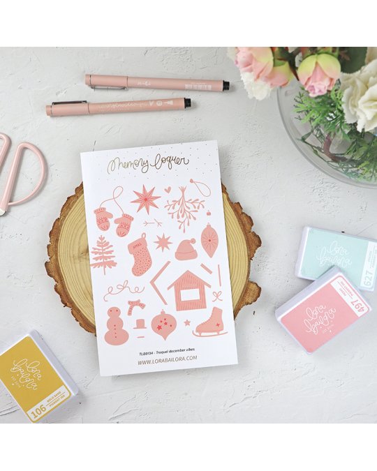 Collection December Vibes - Steffi Ried pour Lora Bailora Ensemble de 25 dies en acier de haute qualité compatible avec la plupart des machines de coupe du marché (Coco Cuttie, Coco Mummy, Big shot, Cuttlebug...). Emballage 13x21cm