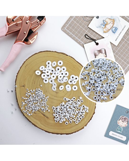 Les œillets minis sont dotés d'un col de 3mn avec une pointe nervurée permettant une fixation par écrasement sur votre papier cartonné.