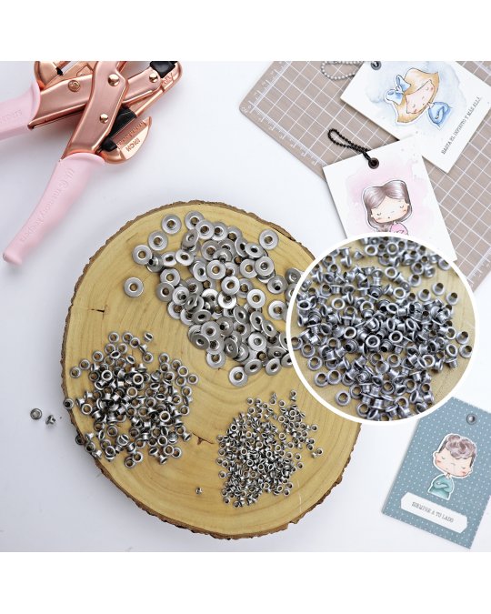 Les œillets minis sont dotés d'un col de 3mn avec une pointe nervurée permettant une fixation par écrasement sur votre papier cartonné.