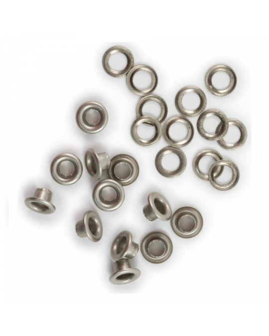 Assortiment d'œillets. Ce lot contient 30 oeillets et 30 rondelles. Couleur : Argent
