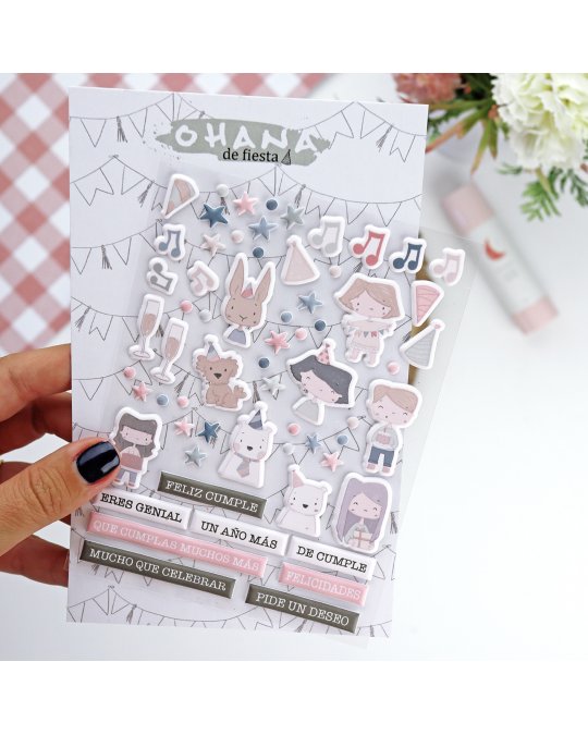 Collection Ohana de fiesta - Alúa Cid Planche de 58 autocollants puffy pour décorer vos albums photos ou Project Life®. Format 10x15cm - Finition matte.