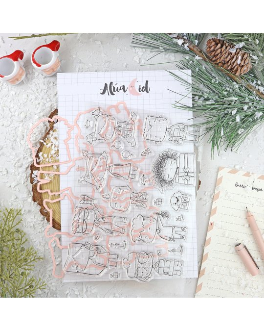 Ensemble de 21 tampons et 9 dies assortis dont 9 personnages.