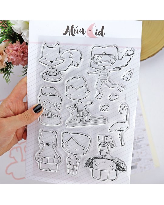 Collection Ohana en la playa - Alúa Cid Planche de 11 tampons clear en polymère de haute qualité. Fabriqué en Europe. Taille des personnages 5-8cm Format A5 (15x21cm)
