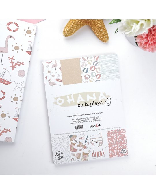 Collection Ohana en la playa - Alúa Cid Bloc de 30 papiers 190g encollés sur la partie supérieure dont 6 papiers unis. Impression recto. Sans acides. Format 6x8" (15x20cm)