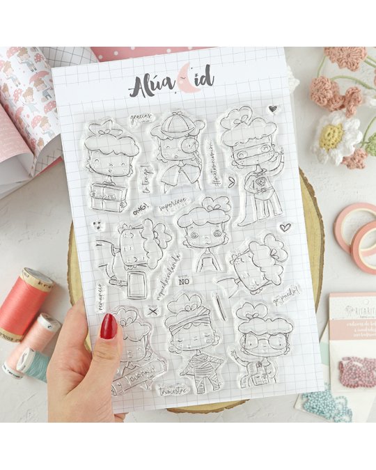 Collection Rita vuelve a casa - Alúa Cid Planche de 24 tampons clear en polymère de haute qualité. Fabriqué en Europe. Dont 9 personnages. Taille des personnages 5-8cm Format A5 (15x21cm)