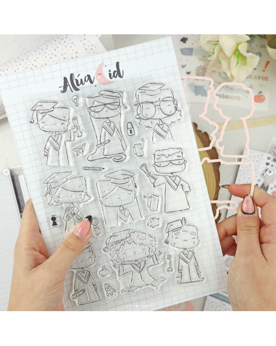Ensemble de 21 tampons et 9 dies assortis dont 9 personnages.