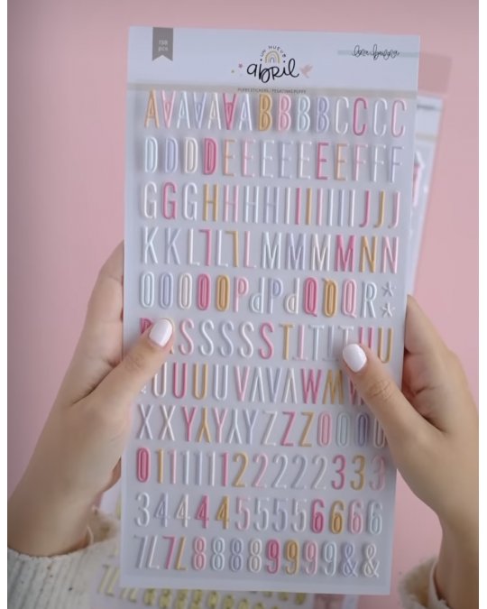 Collection Un nuevo abril - Lora BailoraPlanche d'autocollants alphabet puffy. 158 éléments. Hauteur des lettres 2cm - Finition : Mat.Format 15x30cm